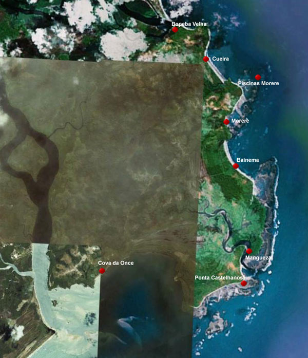 La siguiente es una imagen de Google Earth (lamentablemente, la foto de alta resolución cubre solo la parte interior de la isla y no la costa con las playas), ubicando algunos puntos.
