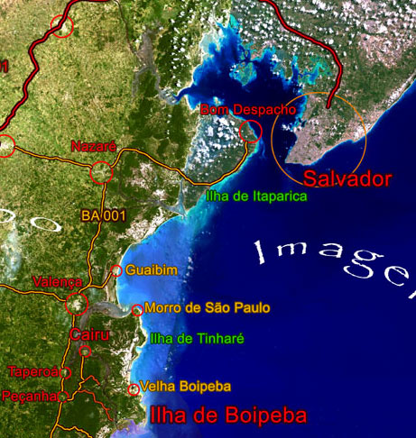 La isla de Boipeba queda al sur de Bahía, justo debajo de la isla Tinaire (donde se encuentra el más conocido Morro de Sao Paulo). La vía clásica y más económica es cruzar la Bahía de Salvador, por barco, hasta la isla de Itaparica, que está conectada al continente mediante un puente. Se puede cruzar con Ferry desde el terminal marítimo de São Joaquim hasta Bom Despacho (esa es la opción más económica), o por barco desde el terminal marítimo ubicado frente al Mercado Modelo y que cruza hasta Mar Grande. A partir de cualquiera de estos puntos se prosigue por tierra hasta Valença. Desde Bom Despacho se puede tomar omnibus o taxi. Desde Mar Grande se puede tomar taxi, o bien una va hasta Nazaré y luego omnibus hasta Valença.