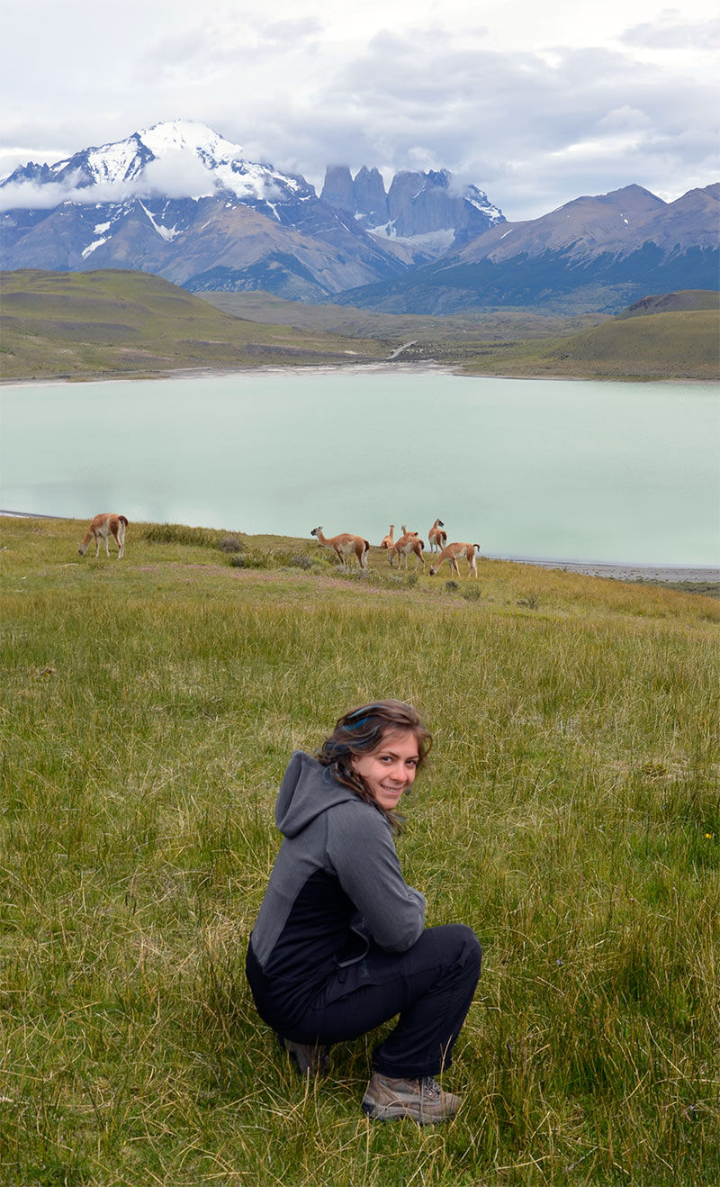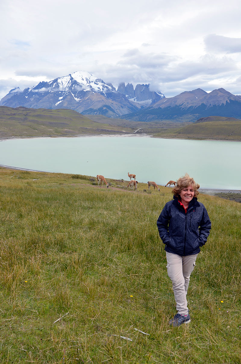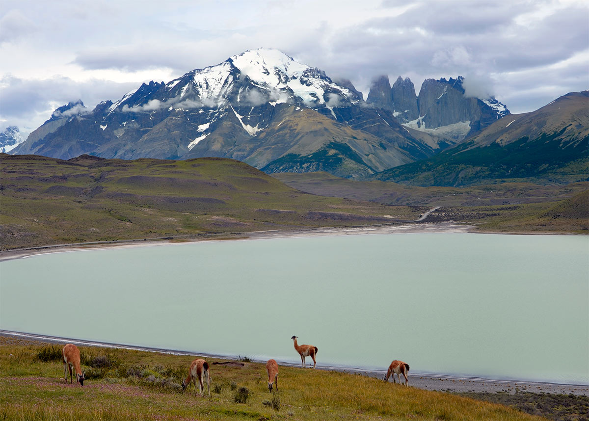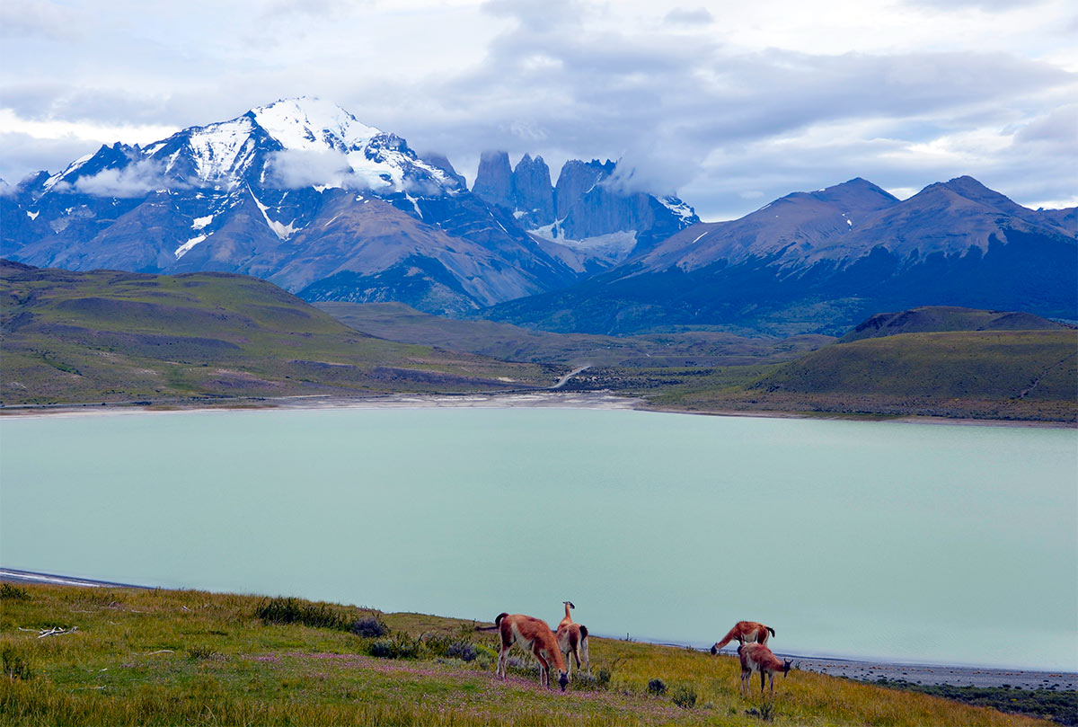 Guanacos y torres de Paine desde la Laguna Amarga