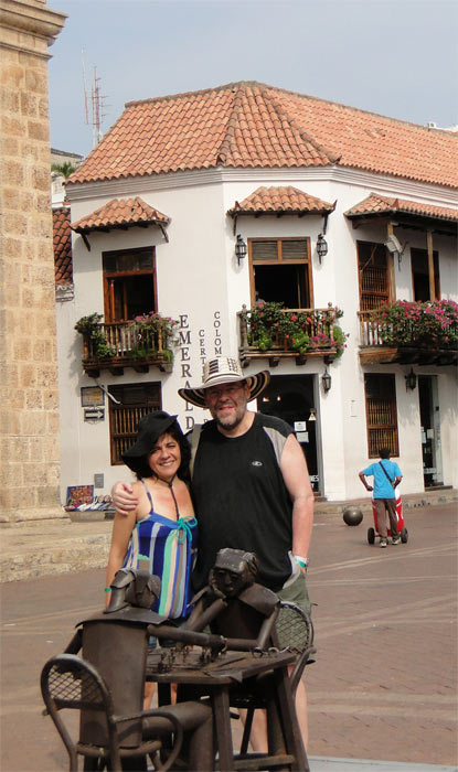 Nora y Michel junto a una de las esculturas de chatarra, y Nora junto a la estatua de San Pedro Claver (el "esclavo" de los esclavos)
