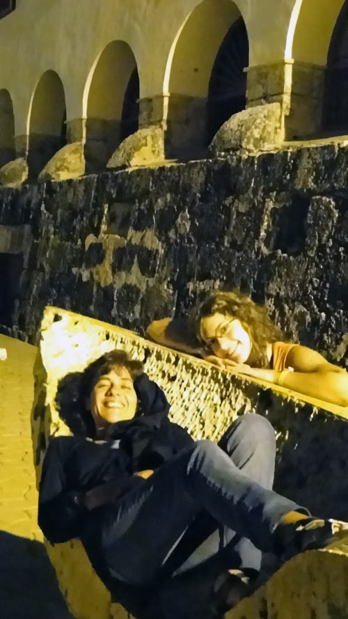 Nora descansando en una de las esculturas que están por fuera de la muralla, una de las veces que esperamos para volver el bus del hotel