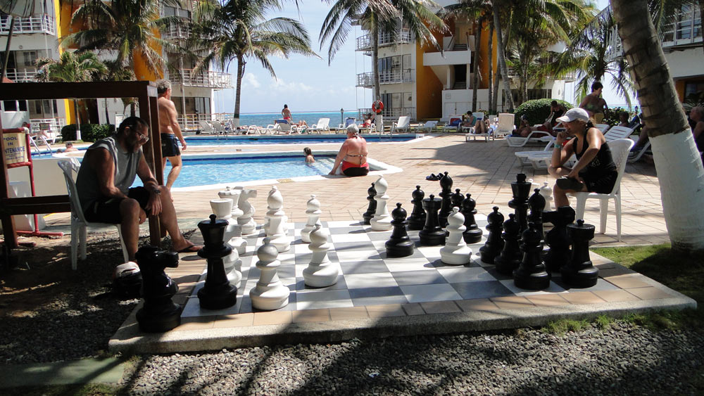 Al lado de la piscina hay un ajedrez de piezas gigantes