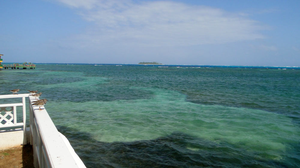 Vista de Jhonny Cay y el mar de los 7 colores desde la zona de la piscina