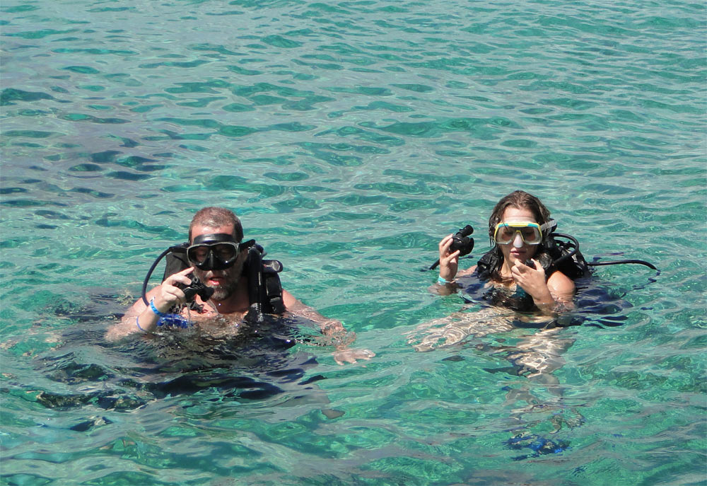 Finalmente, volvimos a la superficie, Diana con el caracol vacío que encontró en el fondo.