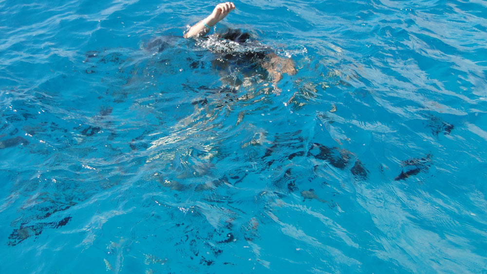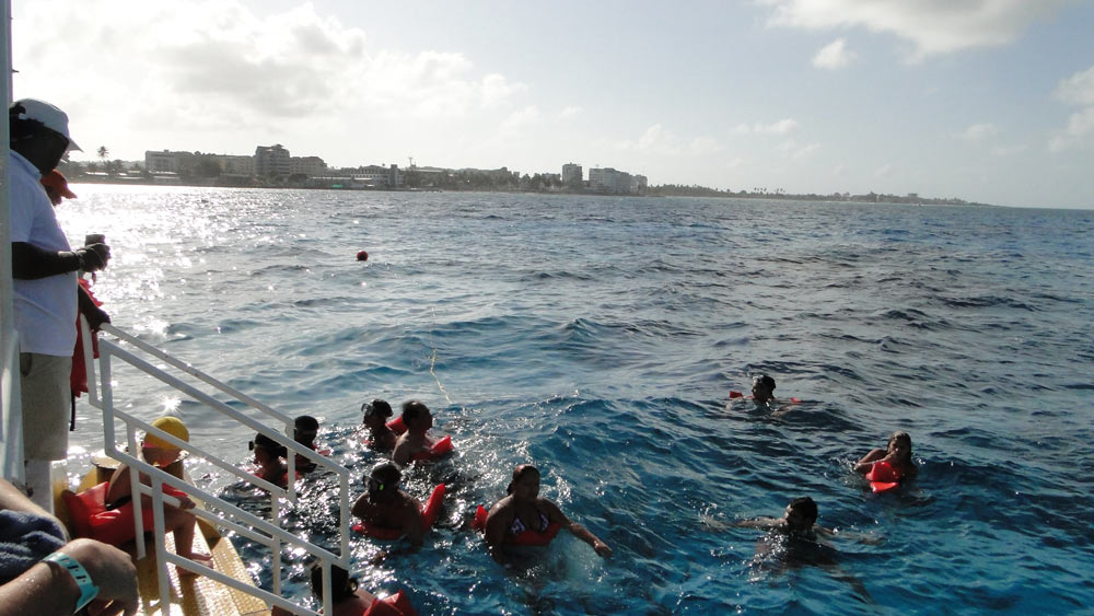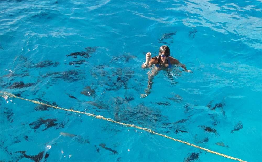 En un momento, a la par del barco, se sumergía este muchacho (Andrés), para alimentar a los peces.