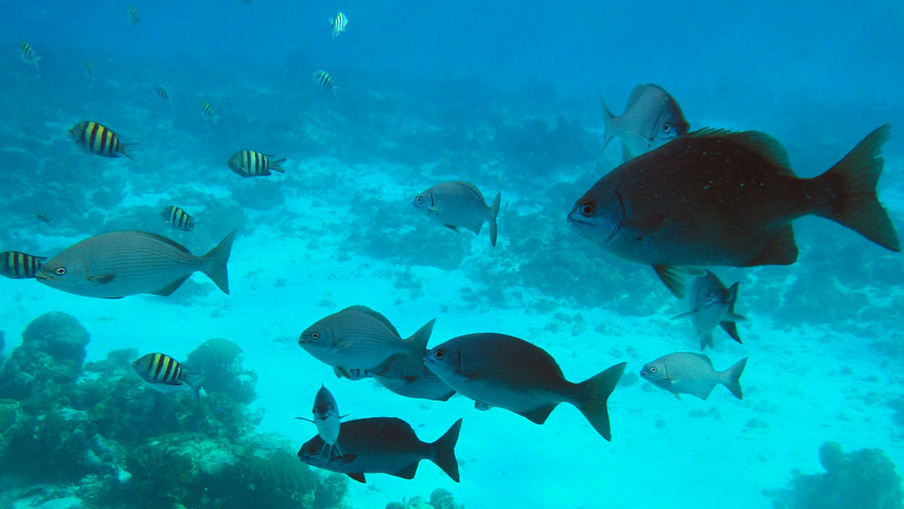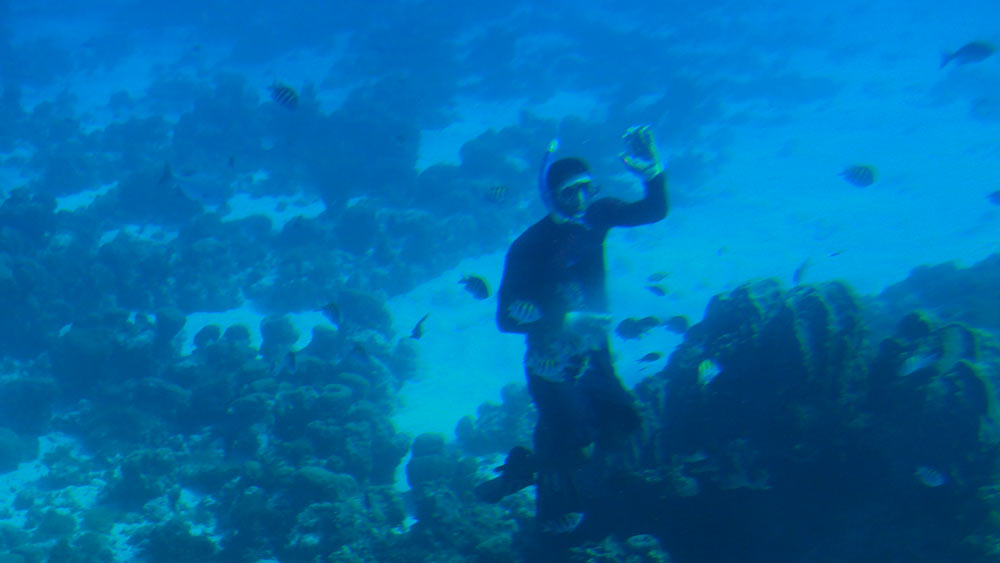 Luego de recorrer la pared de corales, el barco se ancló para permitir que la gente se tire al mar y juegue alimentando peces un poco más grandes.
