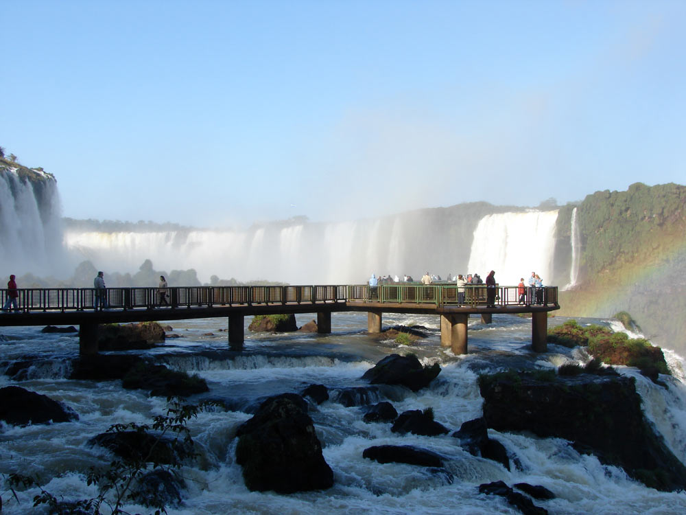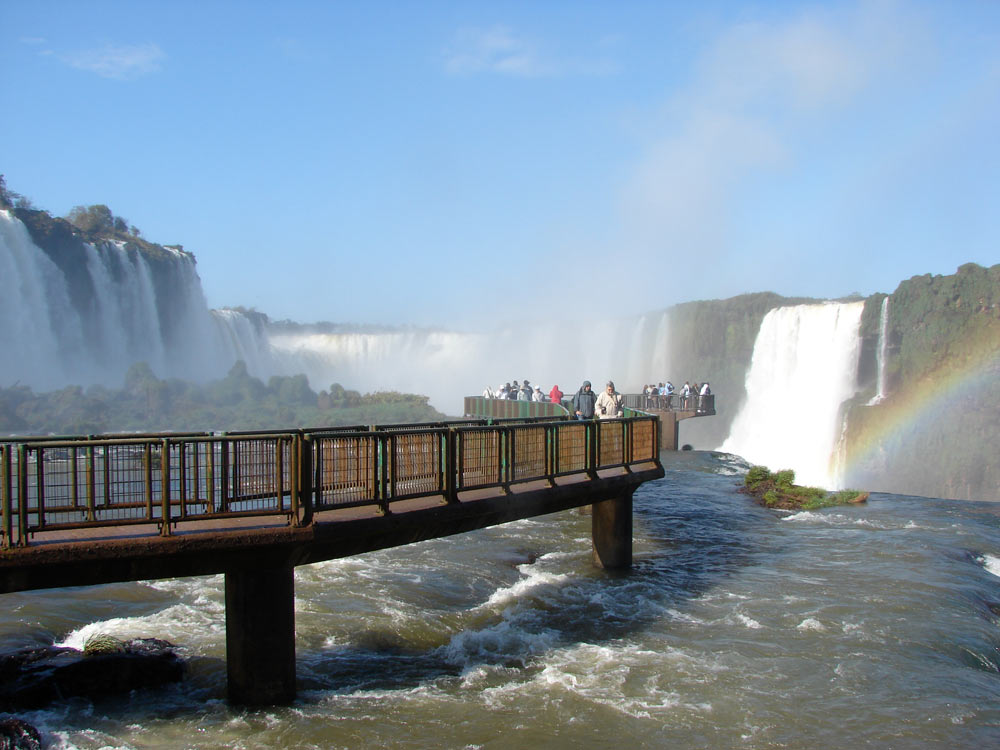 Las pasarelas del mirador brasilero. Al fondo el salto Floriano