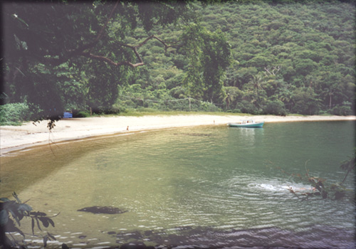 Otra de las playas de la Freguesía de Santa Ana. Ese barquito verde es el Subaru, el "yate" en el que salíamos a recorrer playas y "mergulhos", todos los días, a partir de las 9 de la mañana.