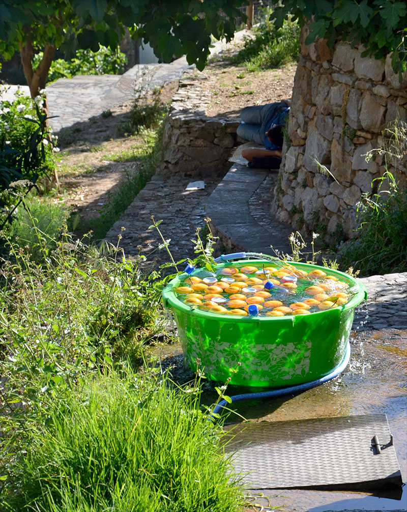Enfriando naranjas con el agua fría del manantial