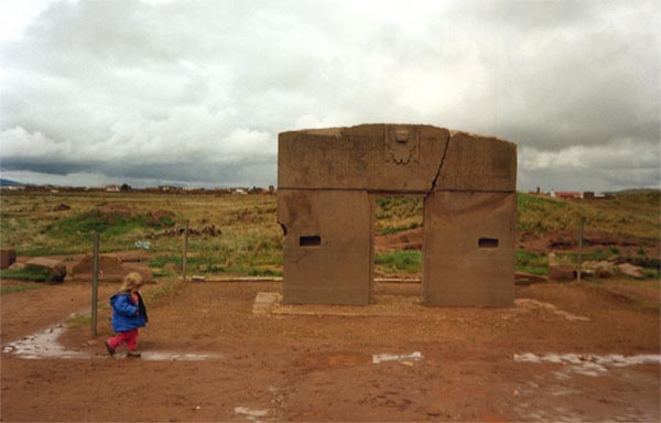 Vista de la puerta de entrada a Kalasasaya y del monolito