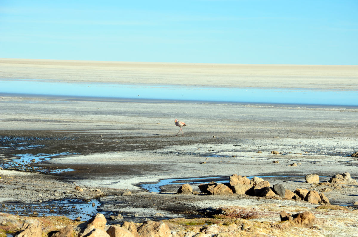 Flamencos en el borde del salar, cerca del Tambo Coquesa