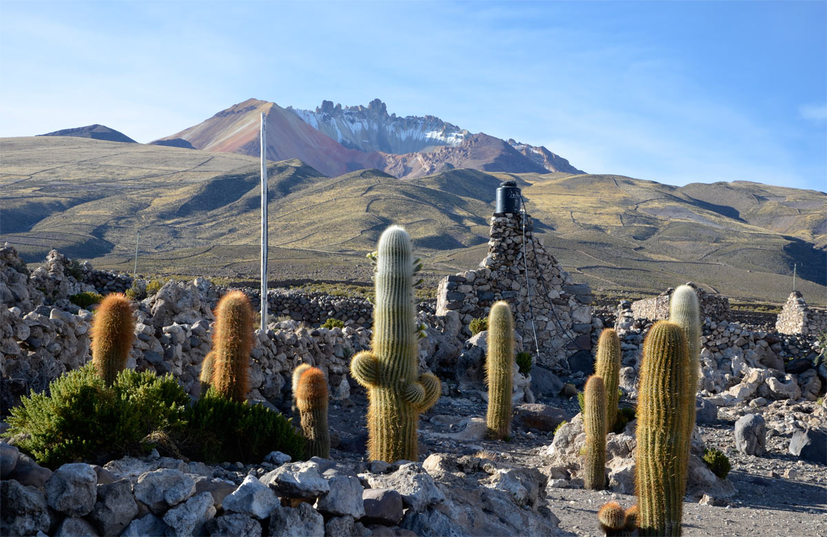 Al fondo, el volcán Tunupa. Antes, el patio con los cactus, y el tanque de agua de la hostería.